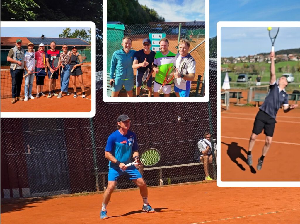 Sportliche Impressionen: Die elegante Mixed Mannschaft um David Grafenauer, Philip Kloibhofer, Andrea Hauer, Simon Hamberger, Luisa Mack und Lea Kloibhofer, Vereinsmeisterschaftsfinalisten Hamberger und Hamberger (Mitte) mit Organisator Thomas Stockhammer (links) und Abteilungsleiter Matthias Lux sowie ein paar Aufstiegshelden der 50er Herren: Matthias Lux beim entscheidenden Einzel angefeuert von Thomas Höhn (im Hintergrund sitzend links) und Michael Krimbacher in Action.