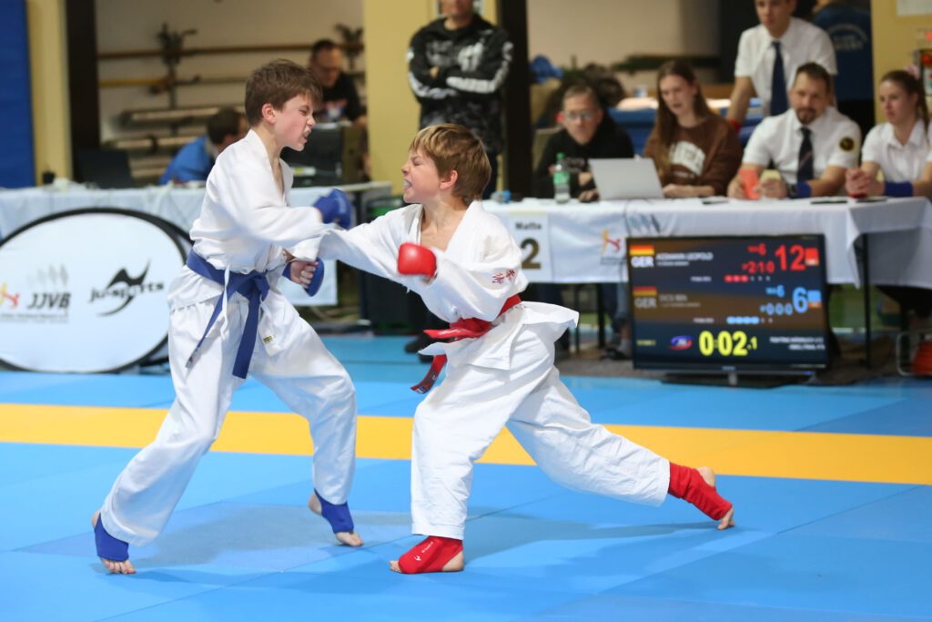 Foto Links: Mit einem kontrollierten Fauststoß konnte Leopold Assmann (rechts im Bild) Punkte sammeln und sicherte sich die Goldmedaille in der Gewichtsklasse -36 kg