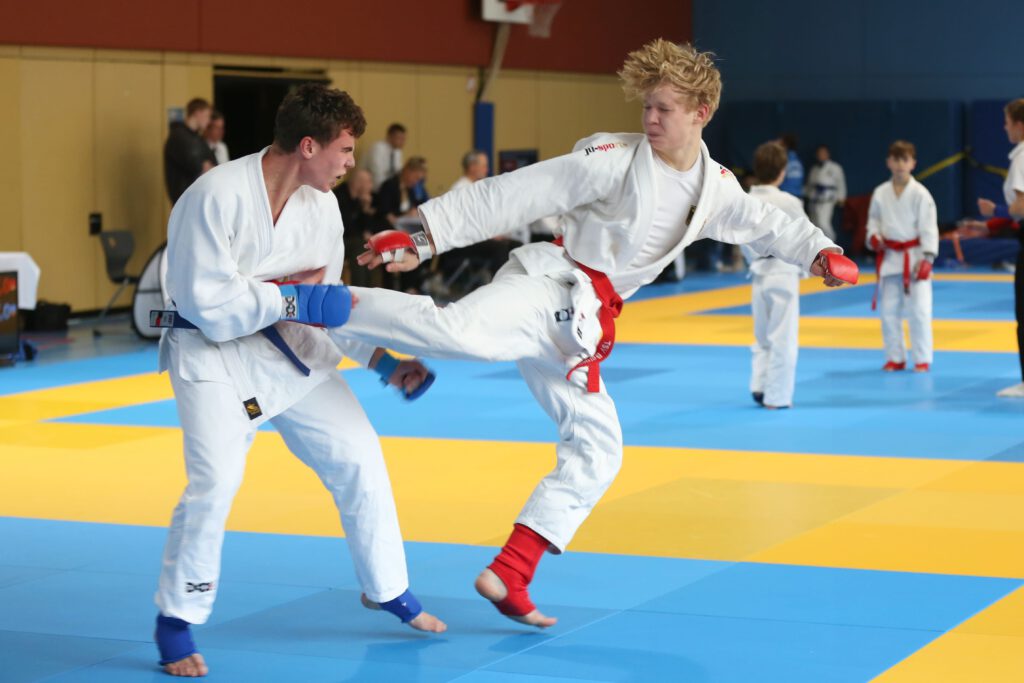 Foto Rechts: Mit einem starken seitlichen Fußstoß punktete Elias Wiedemann (rechts) beim Nikolausturnier in Nürnberg und holte sich verdient die Goldmedaille.